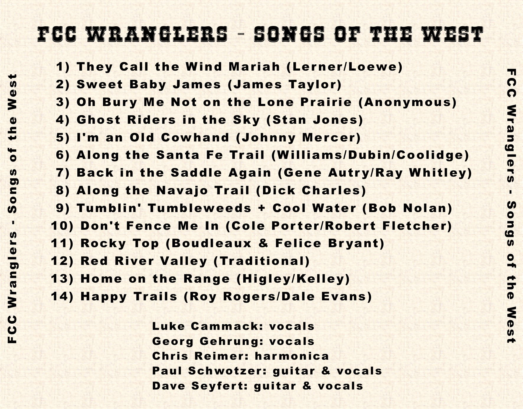 While we enjoy sharing these songs of cattle drives and campfires and the many noble legends of the west, it is not our intent to glorify the westward expansion of our continent, nor do we overlook the fact that indigenous communities were displaced and the land which was their home occupied, often with severe and tragic consequences. Therefore, we wish to express our deep and sincere respect toward those indigenous communities.
