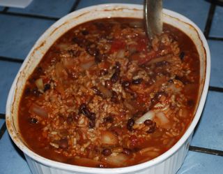 1 C black turtle beans 1 C (raw) brown rice 28oz can whole stewed tomatoes 1 onion + garlic 1 can chopped green chilis 1/4 C red wine 1 Tbl chili powder 2 tsp cumin 1 tsp saltSoak black beans 4 hours or overnight.